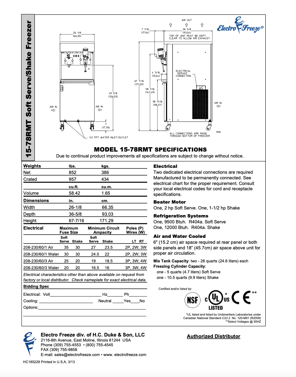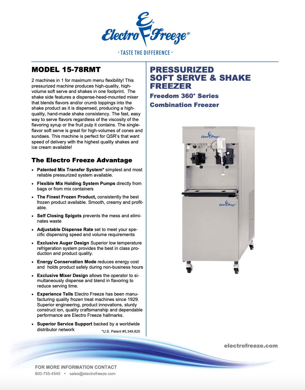 This pressurized machine produces high-quality, high-volume soft serve and shakes in one footprint. The shake side features a dispense-head-mounted mixer that blends flavors and/or crumb toppings into the shake product as it is dispensed, producing a high-quality, hand-made shake consistency. The 15-78RMT is a fast, easy way to serve flavors regardless of the viscosity of the flavoring syrup or the fruit pulp it contains.