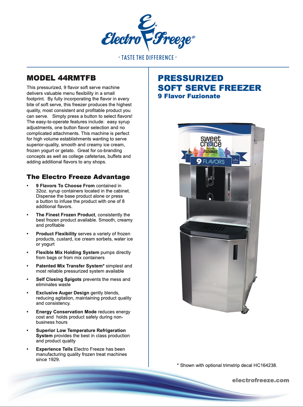This pressurized, 9-flavor soft serve machine delivers valuable menu flexibility in a small footprint making this a perfect addition for any kitchen. By fully incorporating the flavor in every bite of soft serve, this freezer produces the highest quality, most consistent, and profitable product you can serve.